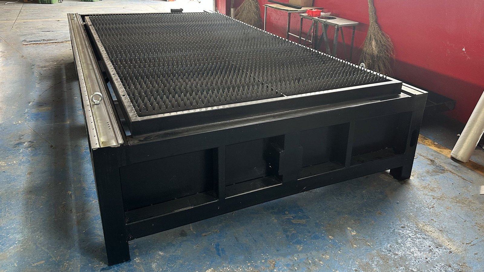 Keep a fire extinguisher nearby. Ensure proper ventilation to remove fumes and smoke. Never leave the machine unattended during operation. Clear debris from cutting bed regularly.